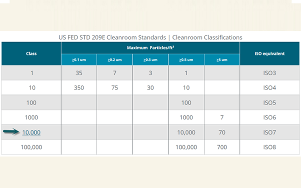 - ISO 14644-1: กำหนดระดับความสะอาดของอากาศใน Cleanroom ตั้งแต่ Class 1 ถึง Class 9 ตามจำนวนอนุภาคต่อปริมาตรอากาศ ยิ่ง Class ต่ำหมายถึงความสะอาดมากขึ้น เช่น Class 1 มีจำนวนอนุภาคน้อยที่สุด